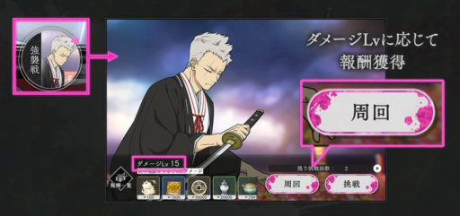 1度強襲戦を行うことで「周回」機能が解放され、前回のダメージLvに応じた報酬を即座に獲得できます。