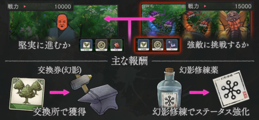 幻影の森は、クリア報酬と敵を比較して、調査領域の攻略を目指すコンテンツです。挑戦中に複数回の進路分岐があり、その都度戦う敵、報酬を選択します。