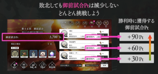 1回の対戦に勝利することで獲得できる御前試合Ptは、表示された3人の対戦相手に対して上から90Pt、60Pt、30Ptです。