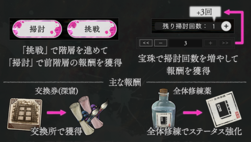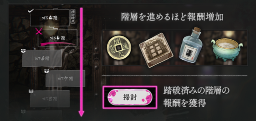 挑戦で階層を進めて、「掃討」で報酬を獲得しましょう。