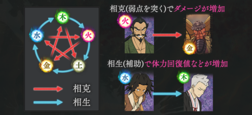 仲間及び敵には「木」「火」「土」「金」「水」の5つの属性が存在し、弱点を突く「相克」が発生すると敵へのダメージが増加、補助関係である「相生」では、味方の体力回復値や強化効果などの値などが増加する。