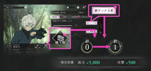 また、各キャラの絆ランクの合計に応じて、「総合絆ランク」が上昇し、仲間全員のステータス値が上昇します。